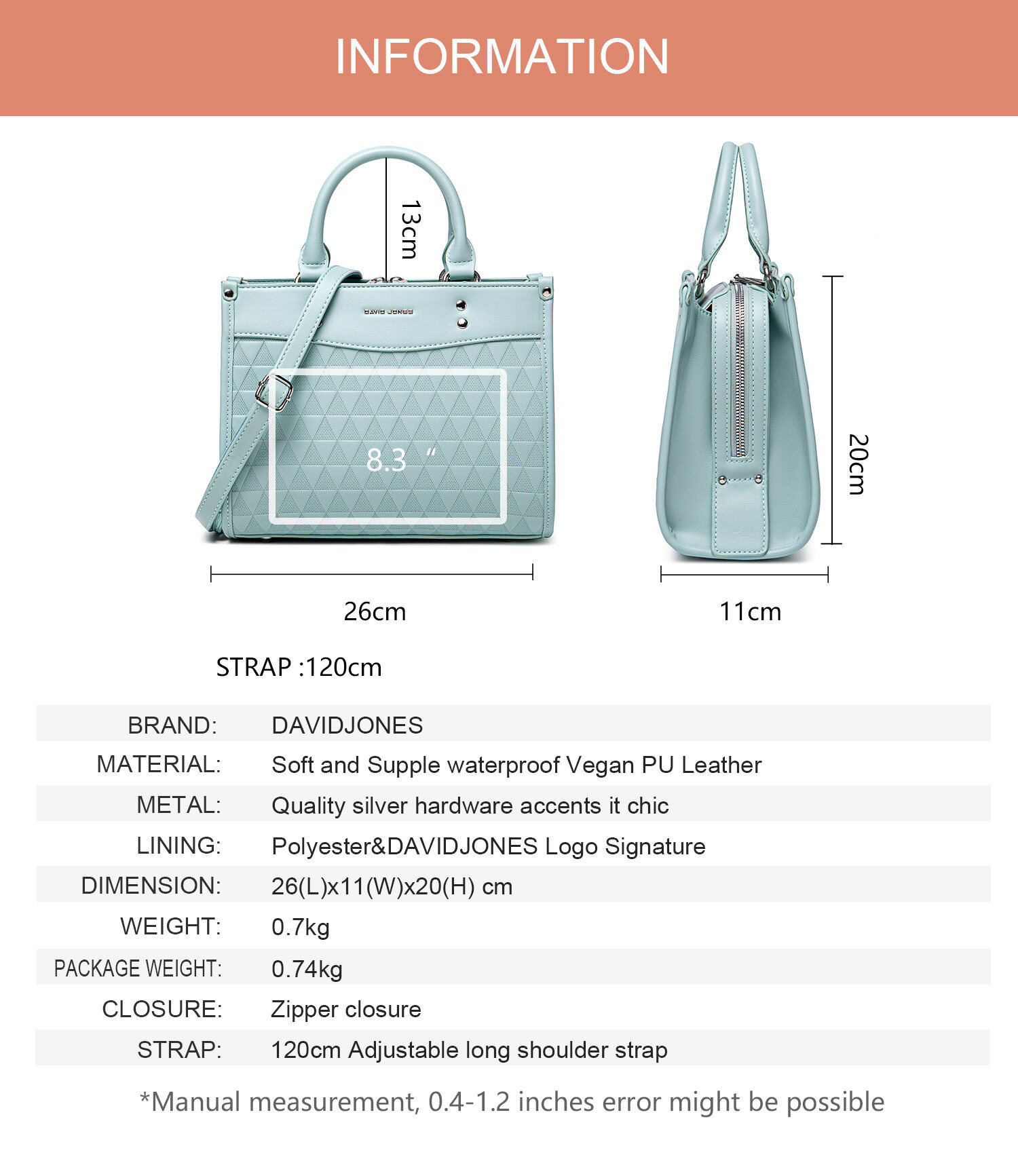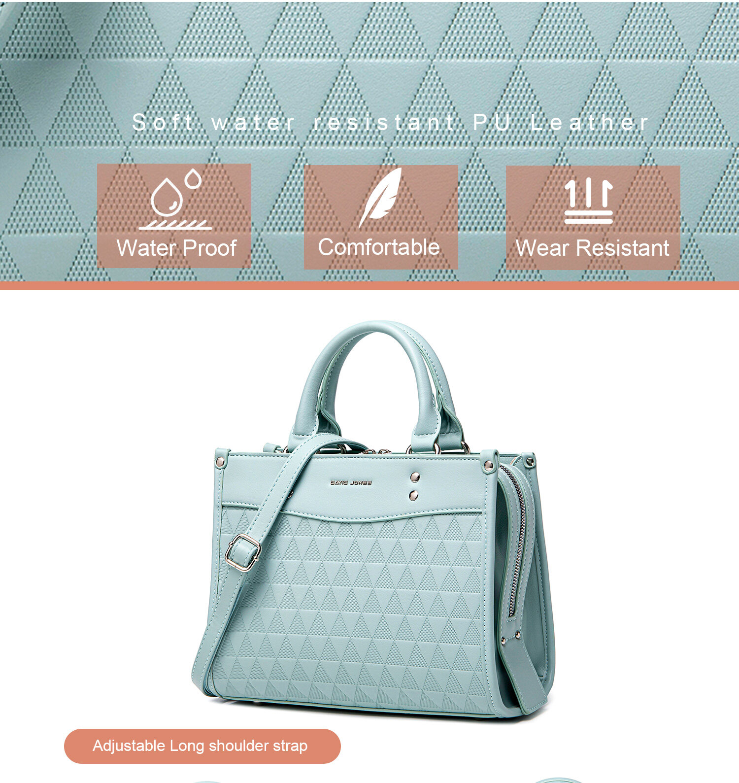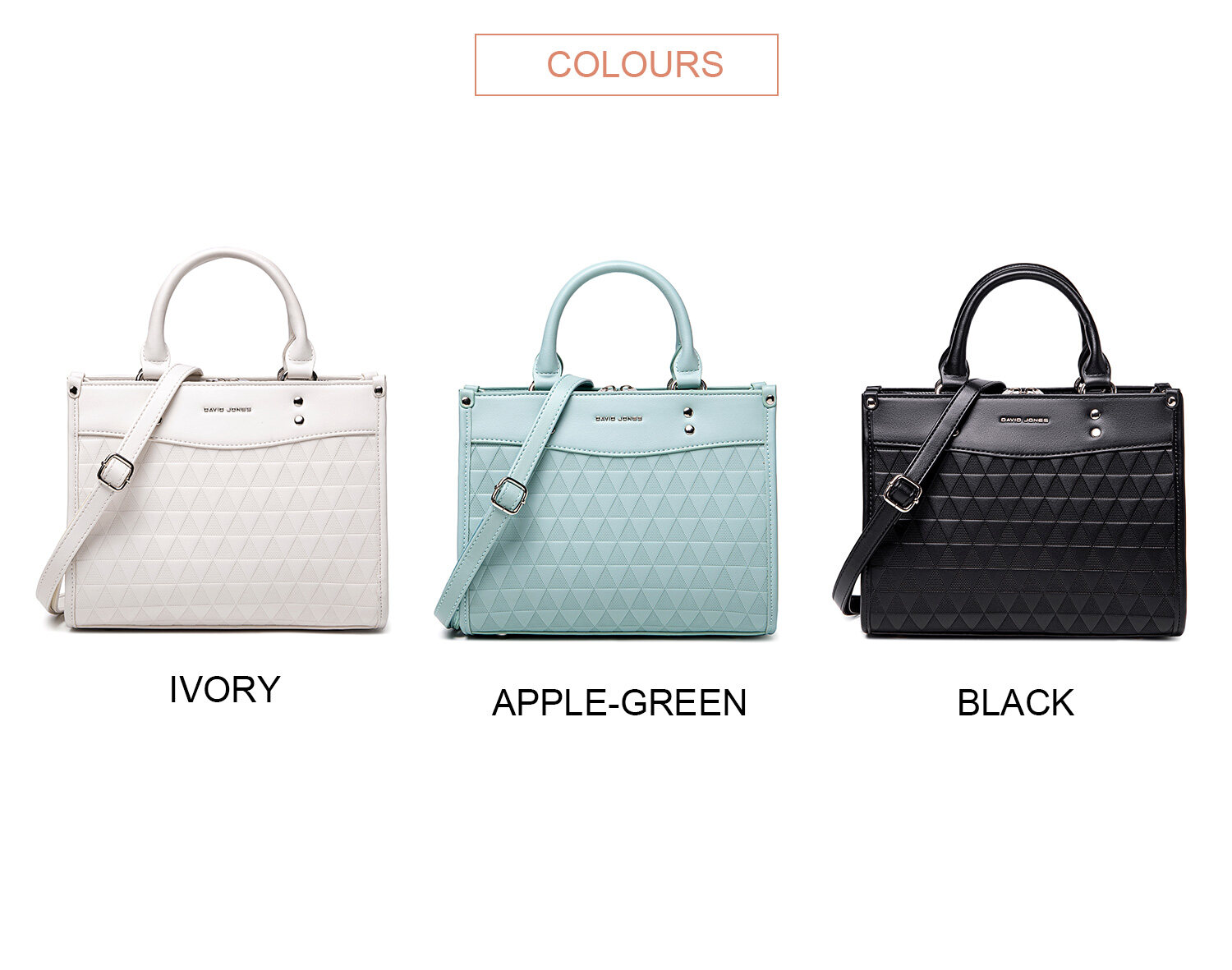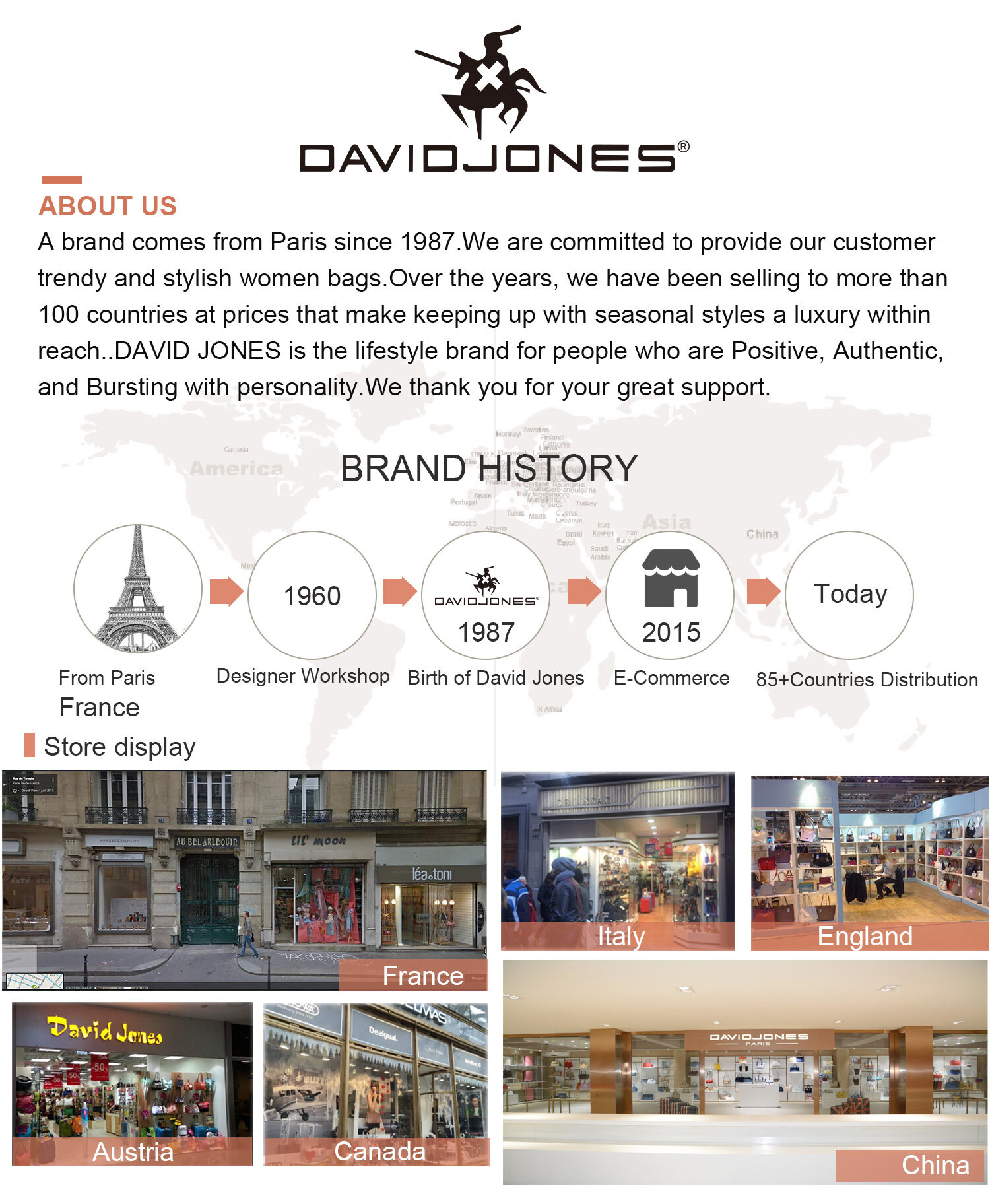 • DAVIDJONES , a brand comes from Paris since 1987.We are committed to provide our customer trendy and stylish women bags.Over the years, we have been selling to more than 100 countries at prices that make keeping up with seasonal styles a luxury within reach.DAVID JONES is the lifestyle brand for people who are Positive, Authentic, and Bursting with personality.We thank you for your great support.