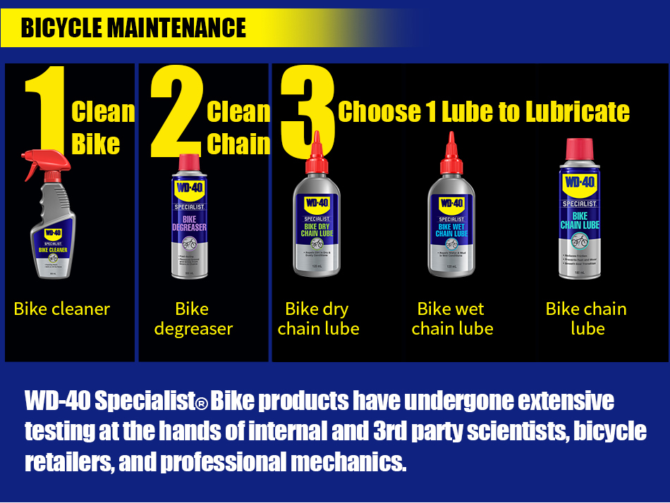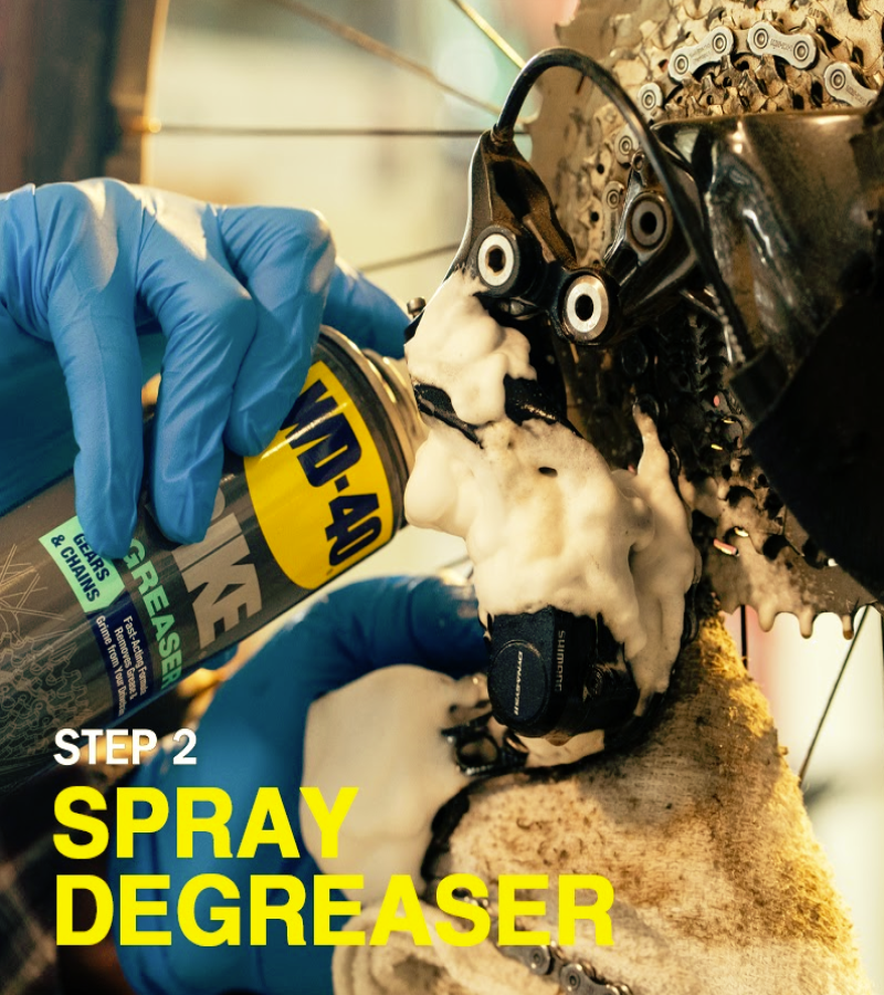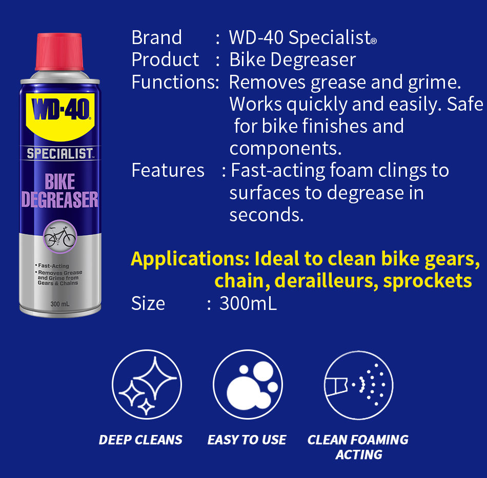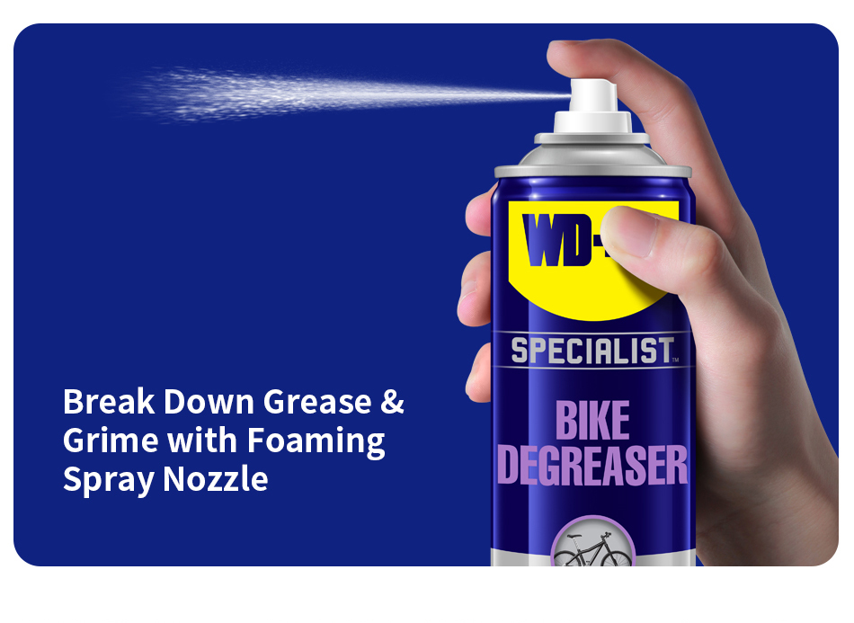 WD-40 Specialist® Bike Degreaser foaming action clings to chain, cogs and gears to deeply penetrate and remove stubborn grease and grime from all moving parts. Experience the difference of a fast-acting professional grade formula that removes dirt, mud & grime.