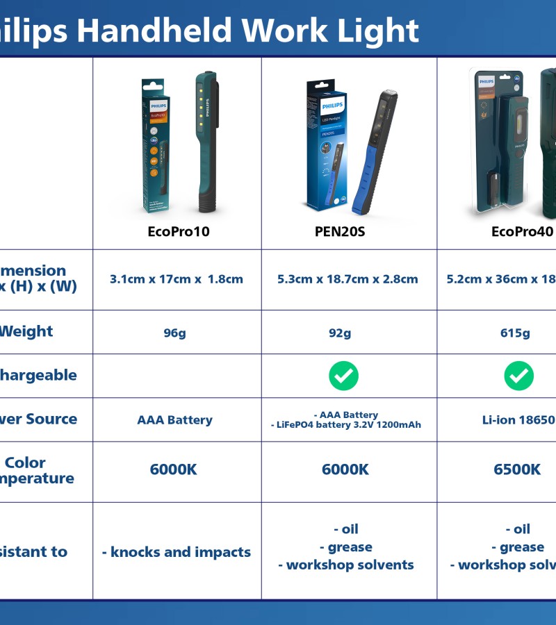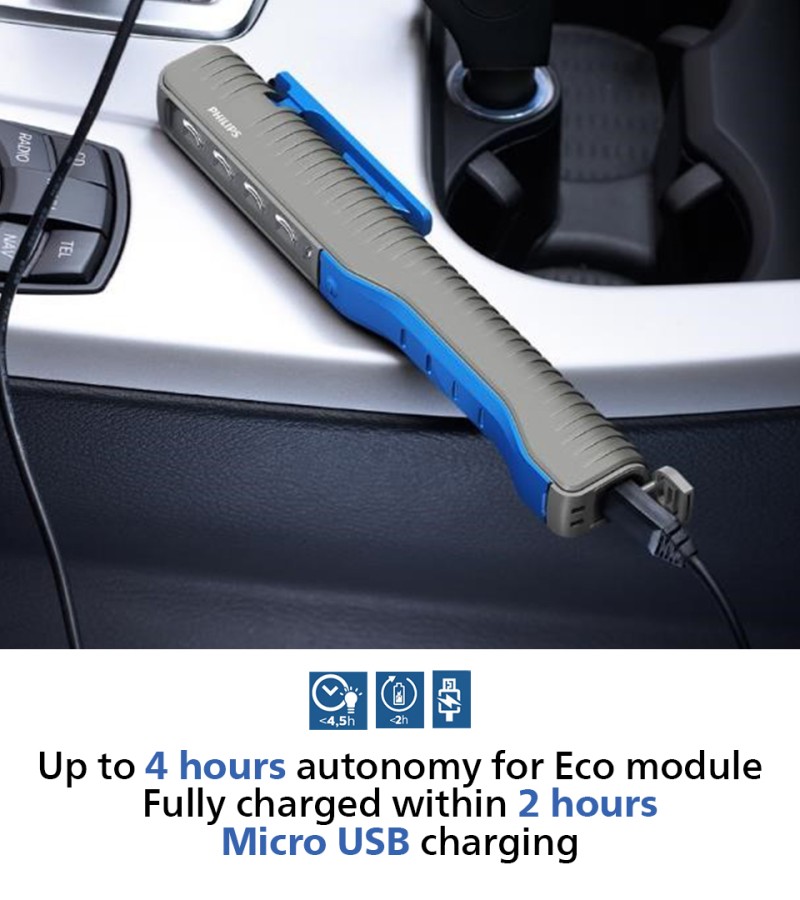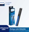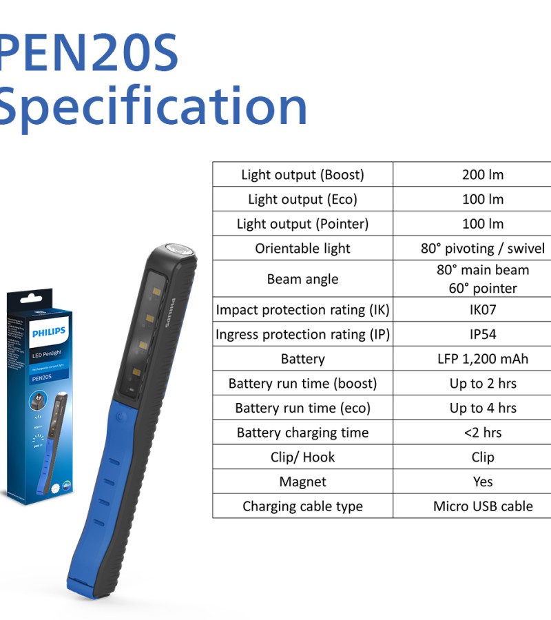 The Philips PEN20S is a compact penlight, ideal for quick inspection jobs. Its 4 high-quality LEDs provide a bright, natural white light of 6000 K, producing up to 200 lm, plus a 100 lm spotlight. Recharge via USB and use hands-free.