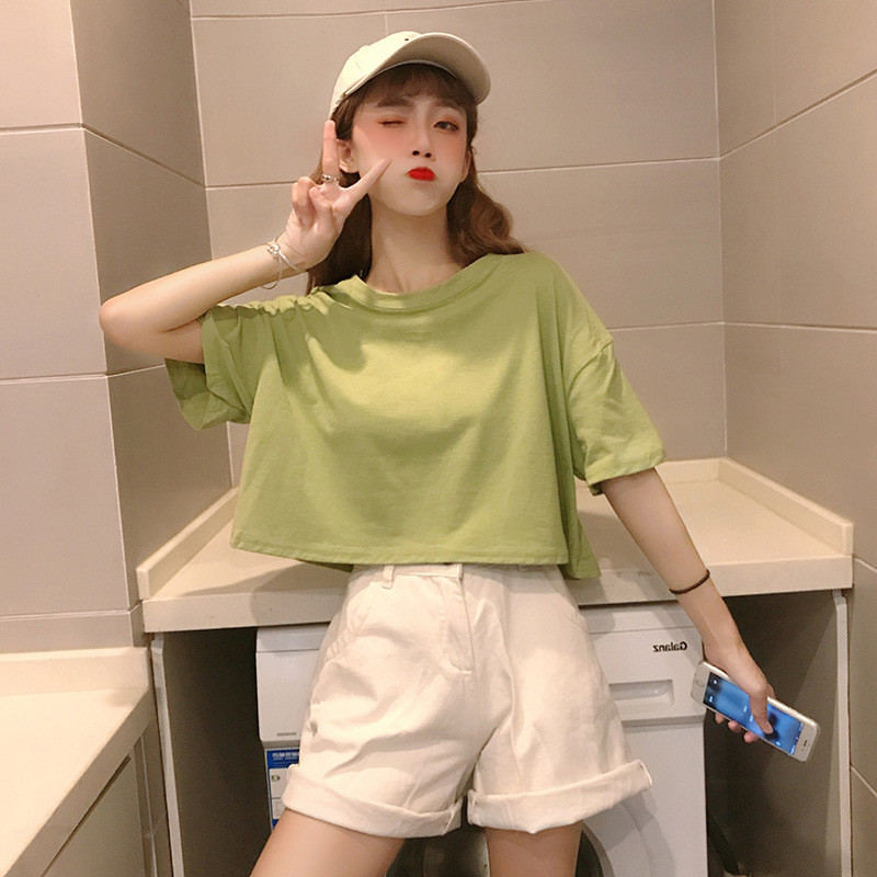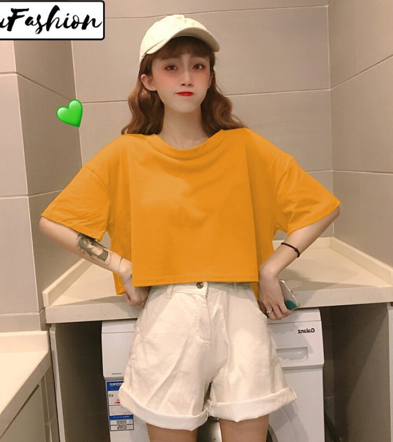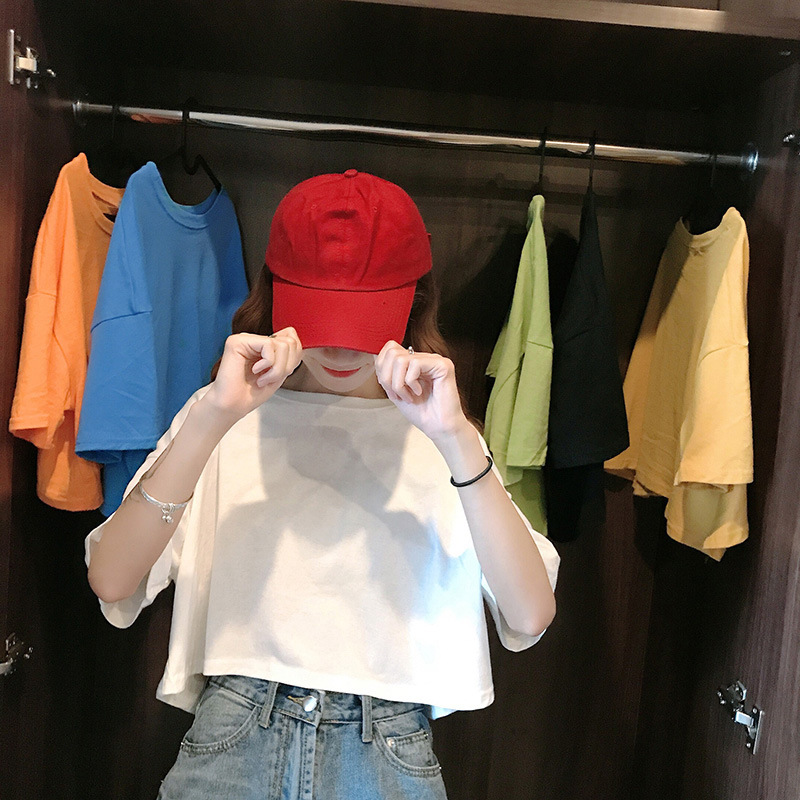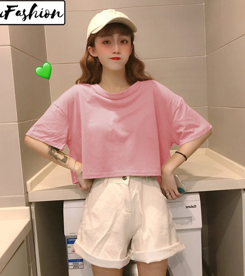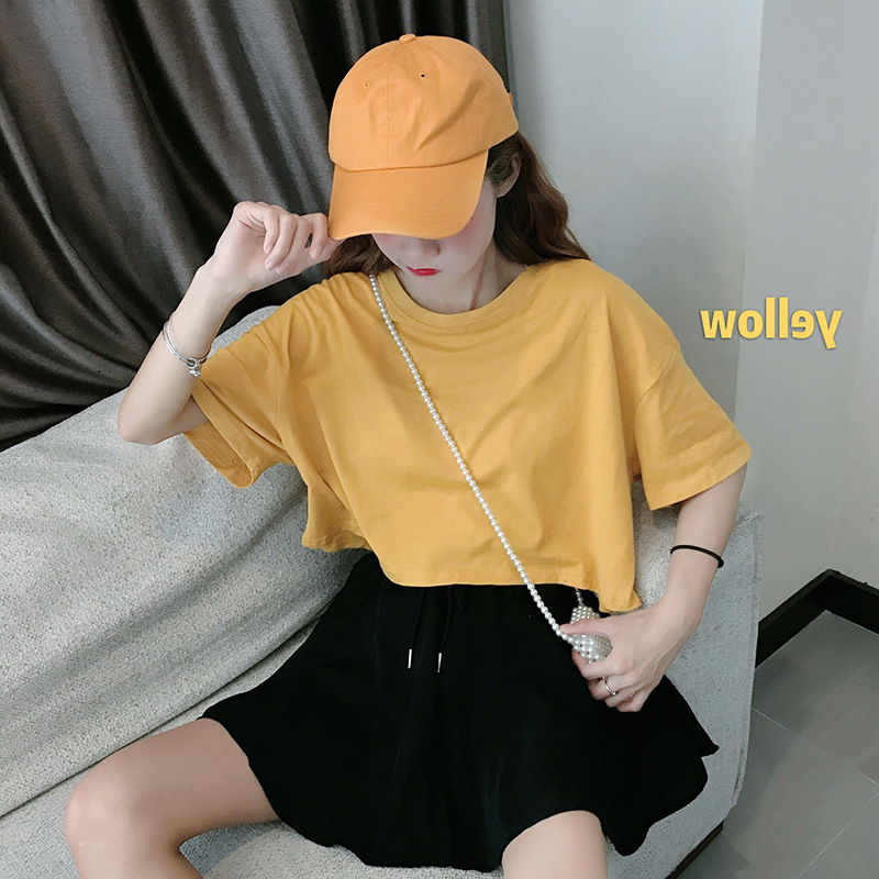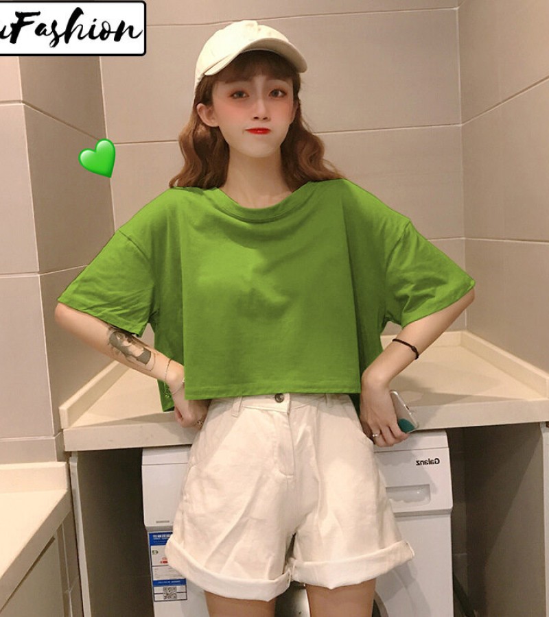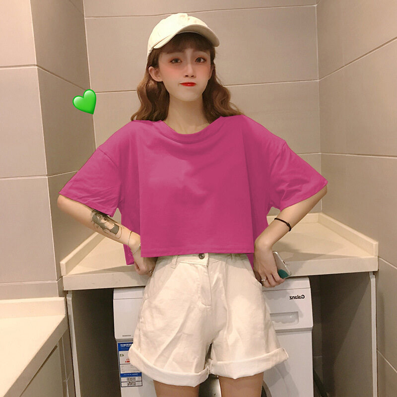 LuFashion女式露脐上衣夏季糖果色短袖素色休闲T恤